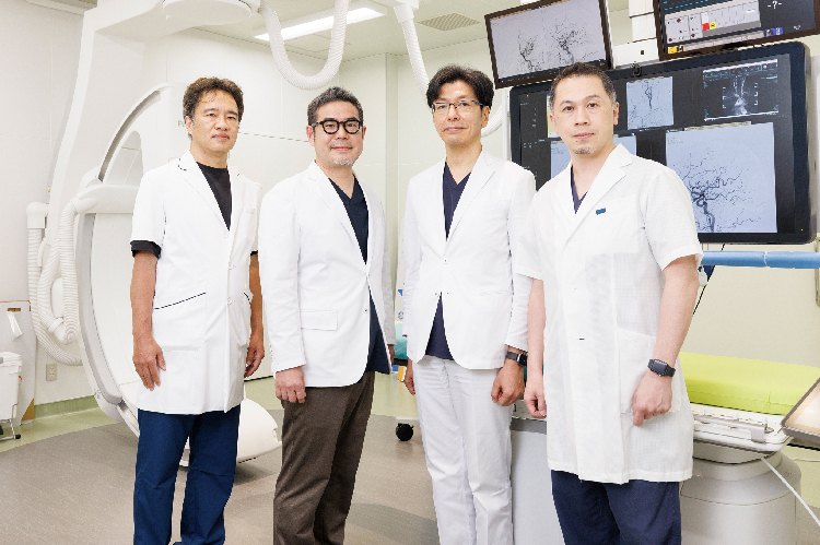 脳神経内科・外科は、脳卒中治療を専門とする4名の医師達が一つのチームとして動いております。脳血管内治療専門医2名で、カテーテルを用いた脳血管内治療(血栓回収、頸動脈ステント留置術、脳動脈瘤コイル塞栓術など)、脳神経外科専門医2名で脳神経外科手術(内視鏡血腫除去術、開頭術、シャント術など)を行なっております。