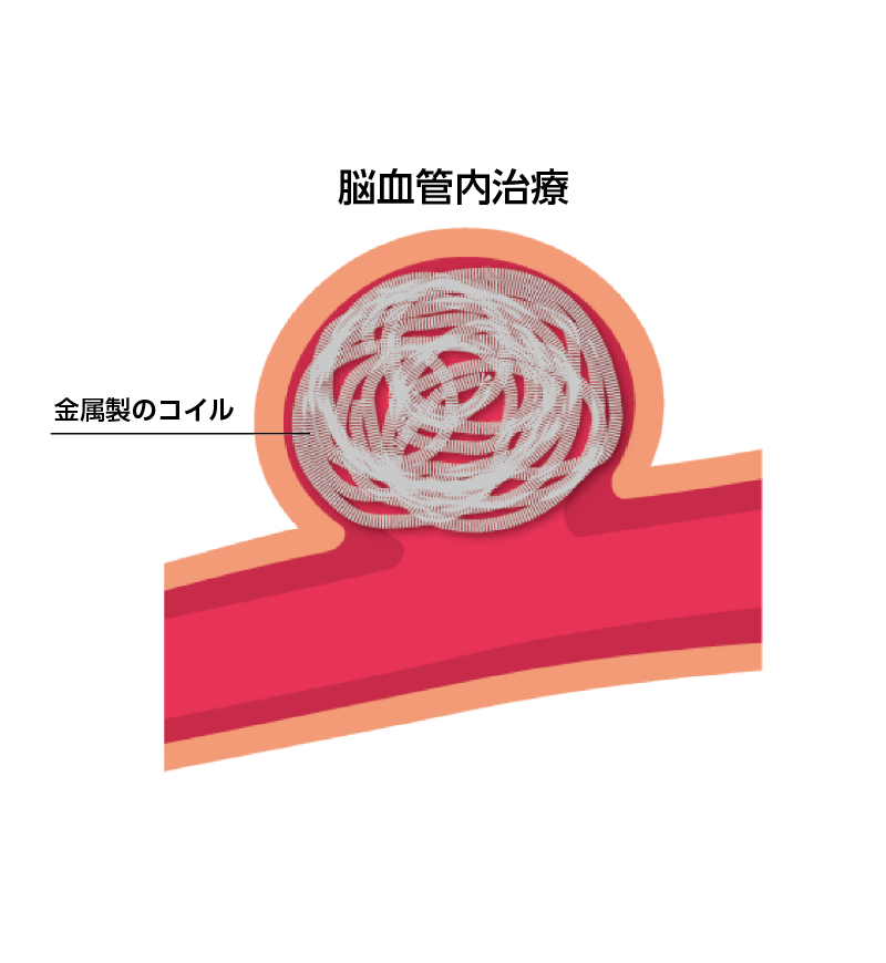 近年、血管内から患部へアプローチして、脳動脈瘤の破裂防止を図る、コイル塞栓術などの脳血管内治療も行われています。鼠径部などの動脈から直径約2㎜の細いカテーテルを挿入させ、さらに細いマイクロカテーテルという直径約0・6㎜〜0・9㎜の管を通し、脳動脈瘤に金属製の細いコイルを挿入して病変部を閉塞。血管が狭くなっている場合、血管拡張用の風船が付いたカテーテルを用いて、内側から押し拡げたり、ステントという筒状の金属を病変部に留置して血管を拡張するなど、状態に応じて様々なデバイスを活用し症状改善を図ります。