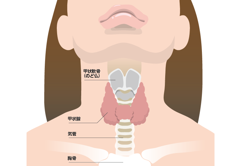 甲状腺は、首の前側、のど仏の下にある蝶が羽を広げたような形状の小さな臓器で、重さは10〜20グラム程度。甲状腺ホルモンを分泌して新陳代謝を活発にし、体温や自律神経を調整しています。甲状腺ホルモンは、心臓や脳の働き、妊娠の維持、子どもの成長など重要な役割を担っており、甲状腺機能に異常が起こると、様々な症状が現れてきます。